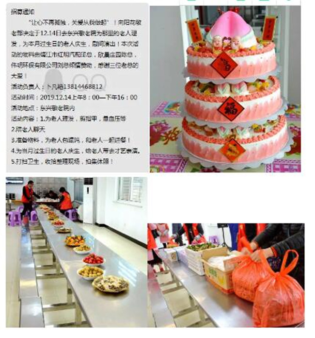 特别感谢:欣晨庄园、红明汽配、伟杰环保三家爱心企业为本次活动提供的生日蛋糕、馄饨、水果干果等总计2700元。