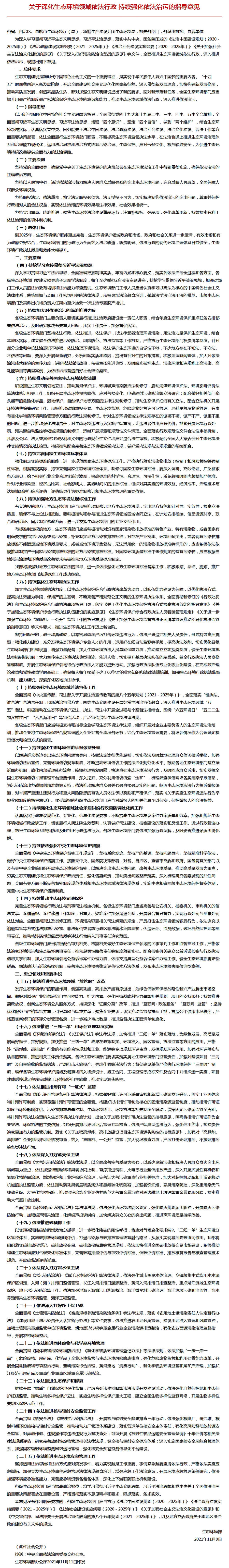 关于深化生态环境领域依法行政 持续强化依法治污的指导意见