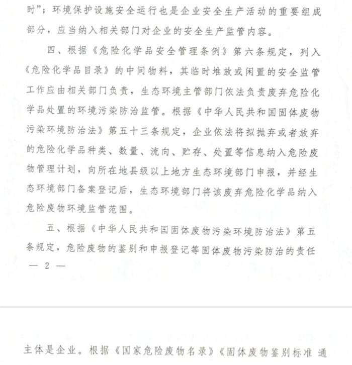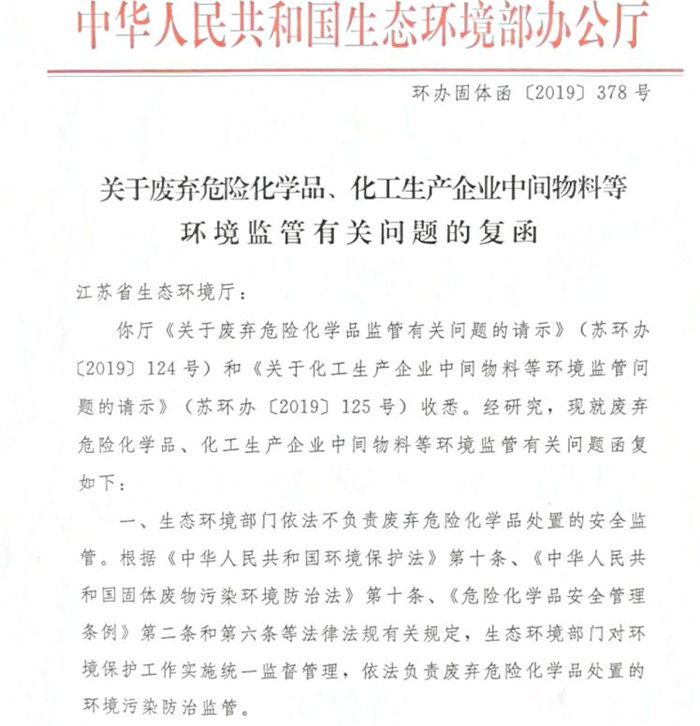 关于废弃危险化学品、化工生产企业中间物料等环境监督有关问题的复函